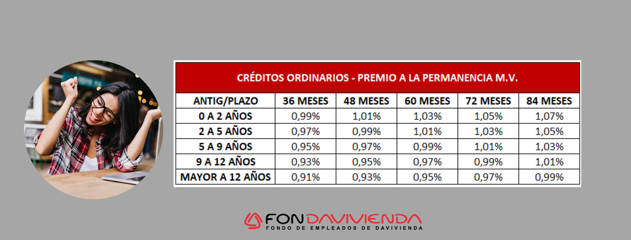 Tu permanencia en Fondavivienda garantiza la solidez financiera facilitando excelente rentabilidad en ahorros y bajas tasas en los productos de crédito; por lo anterior, premiamos tu permanencia en el crédito ordinario, ofreciendo plazos hasta de 84 meses y tasas desde el 0.91% M.V.